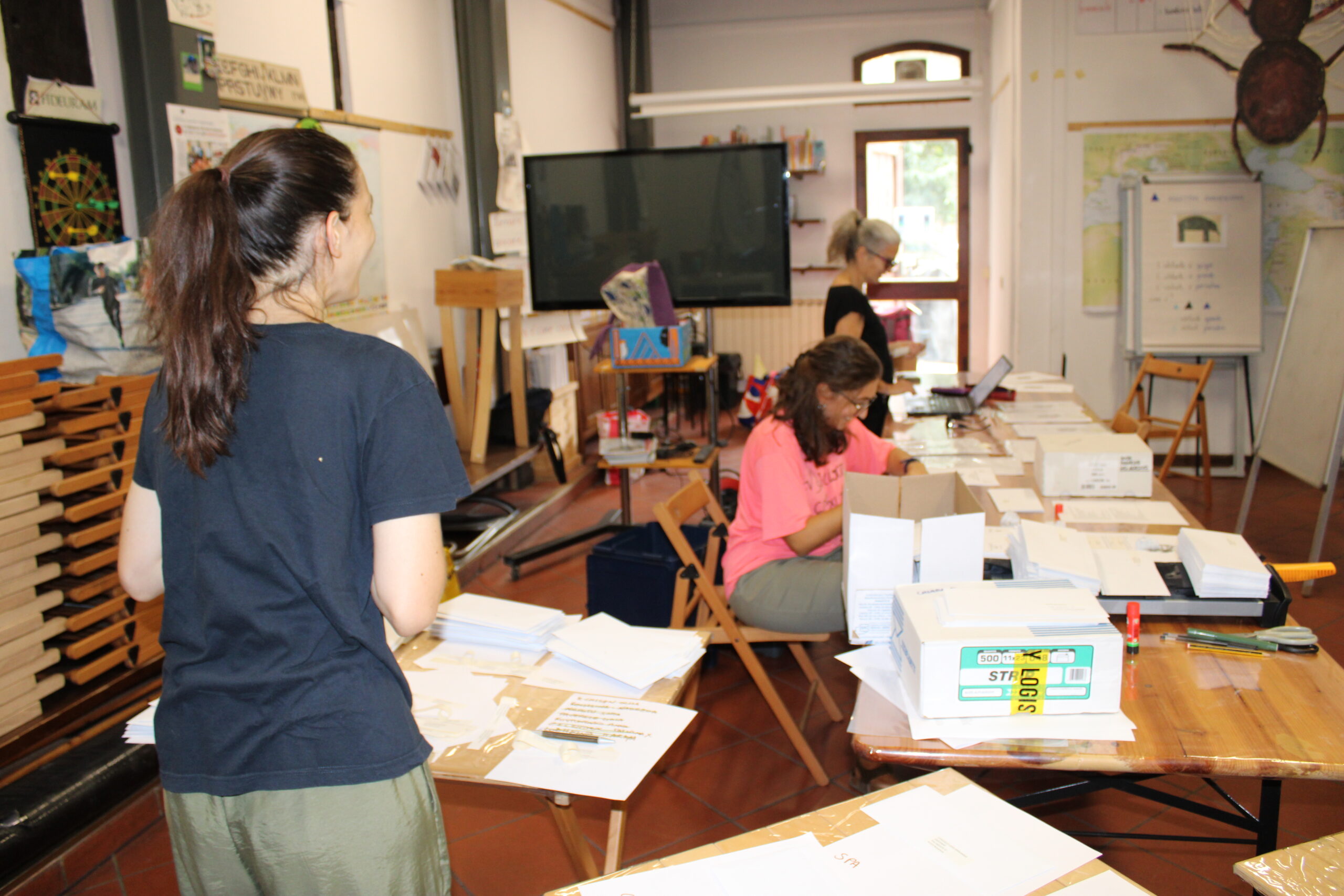 L’imbustamento, a cui anche noi di Giunchiglia-11 collaboriamo, comporta almeno due giorni di lavoro, se qualcuno dei vecchi studenti si offre di darci una mano, qualcuno di più se siamo solo noi maestri e maestre.